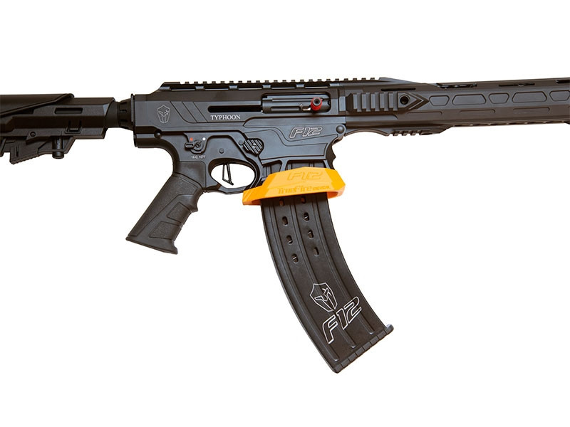 Competition-ready flared magwell for the Typhoon F12 — speeds up reloads with a beveled, larger feed opening. Available in 7 colours: Black, Red, Grey, Gold, Orange, Yellow, Blue.